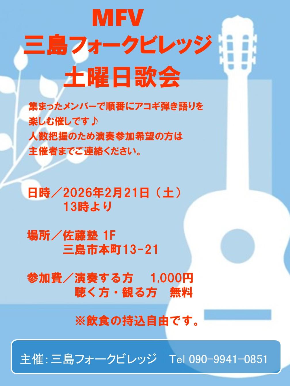 月イチで開催している土曜日午後のMFVのお知らせです。会場は三島市本町交差点の佐藤塾、開催日時は第3土曜日2月21日(土)13時からです。演奏者枠は申込先着8組以内としておりますが、定員に達したため募集は締め切っております。 演奏できる曲や運営方法は定例MFVのルールと同様で、2曲ずつ順番に時間内で回れるだけ演奏しますが、概ね2~3回程度の演奏機会になると思います。 聴くだけ・観るだけの方は無料・出入り自由です♬